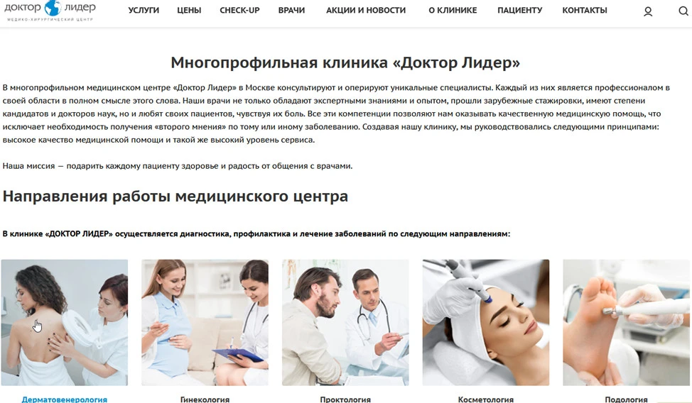«Доктор Лидер» — многопрофильный медицинский центр, работающий с 2013 года. В команде работают ведущие врачи России с мировым уровнем образования и колоссальным опытом, которые лечат самые сложные заболевания по широкому спектру направлений: от косметологии и дерматовенерологии до флебологии, гинекологии и проктологии.