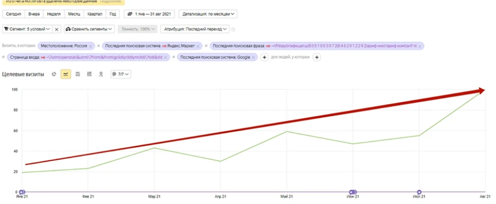 Количество кликов по номеру телефона увеличилось с 19 в январе (месяц настройки цели) до 100 в августе.