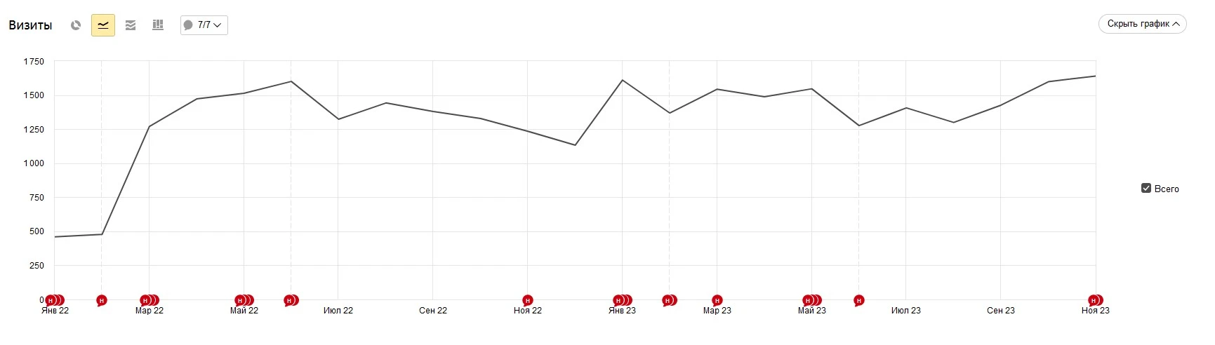 Количество визитов в месяц увеличилось с 459 до 1640.