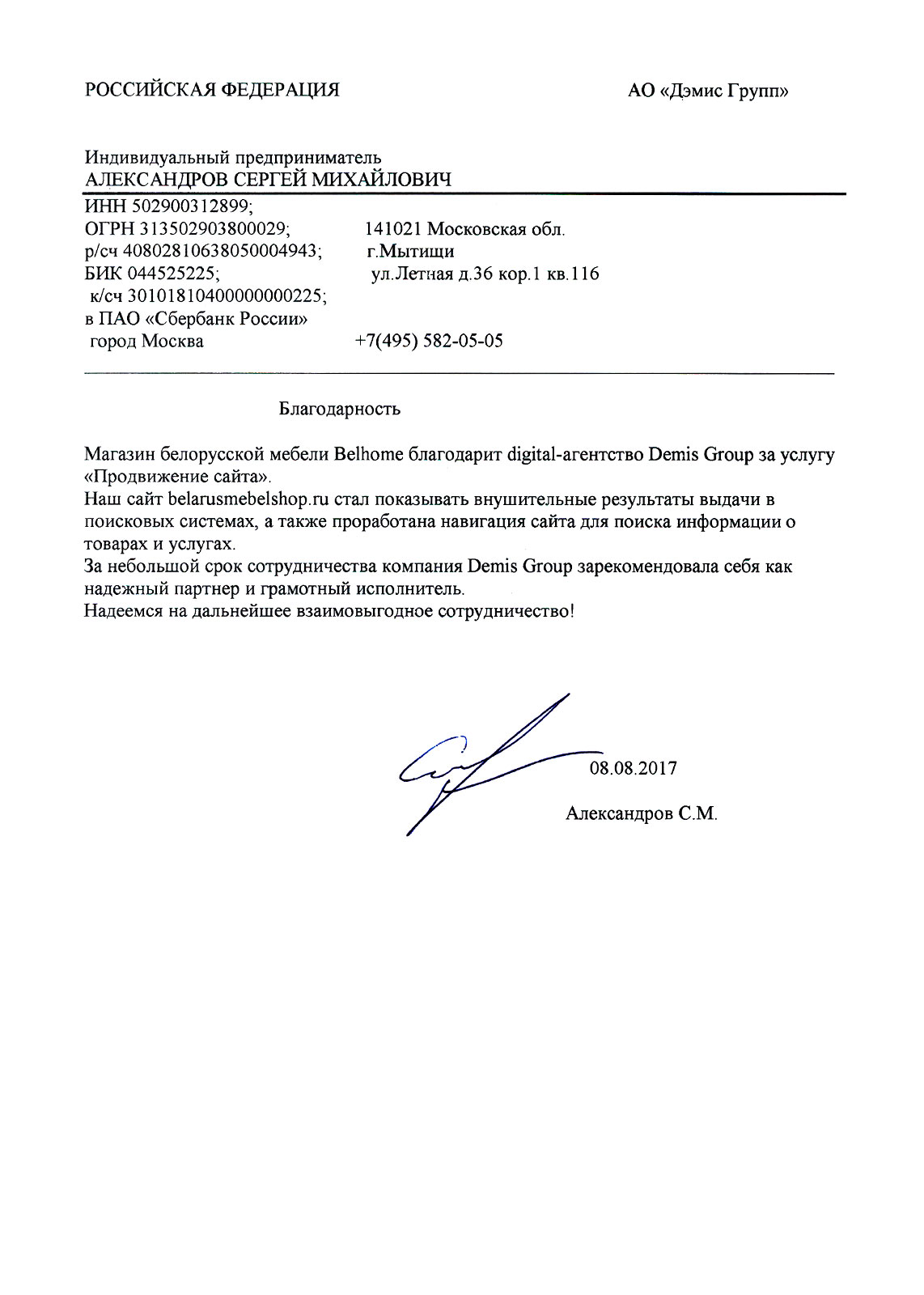 ООО «Тактика Бизнеса» выражает благодарность коллективу компании «Demis Group» за плодотворное сотрудничество, целью которого являлось создание и продвижение нашего сайта.