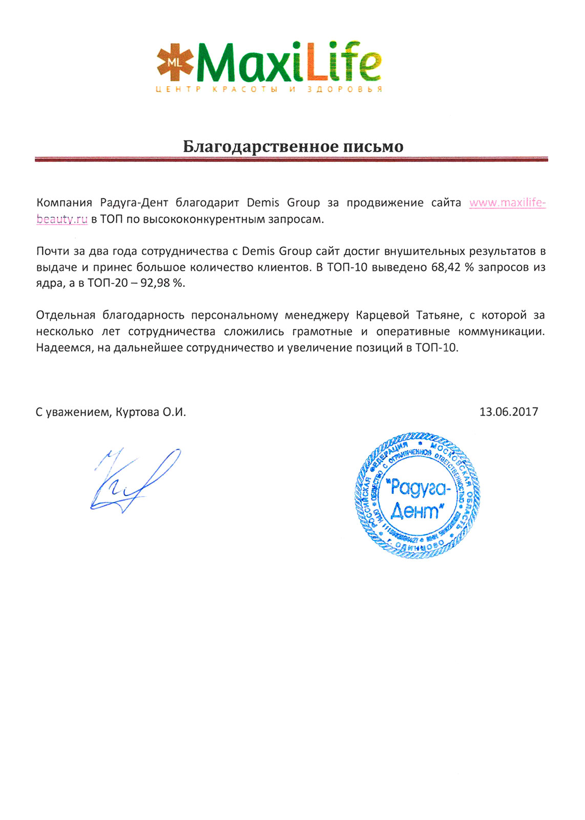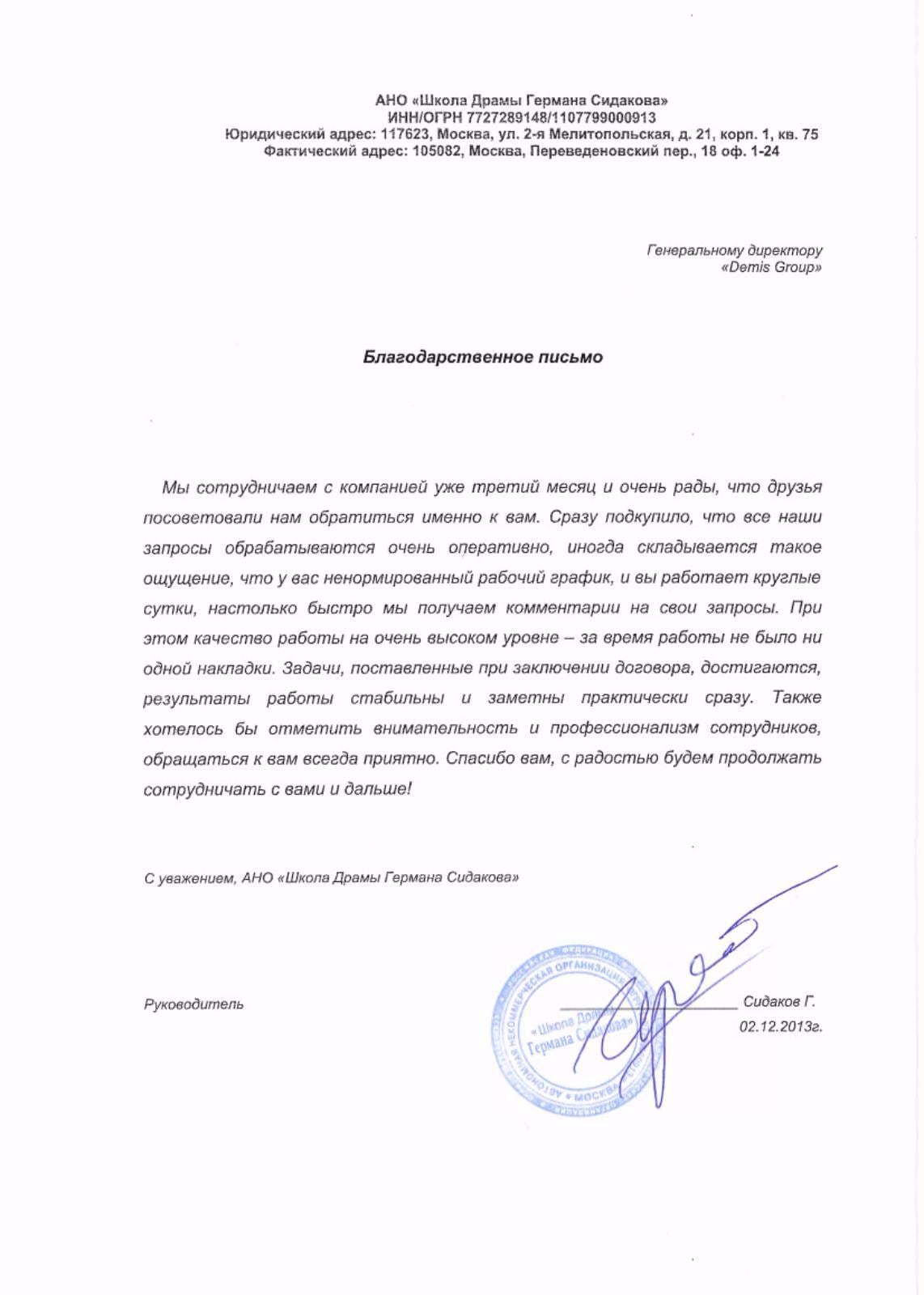 Школа «Кайман» благодарит компанию «Demis Group» за профессиональный подход к продвижению нашего сайта www.cayman.msk.ru. Благодаря усилиям сотрудников вашей компании наш сайт за три месяца вышел в лидирующие позиции в поисковых системах.