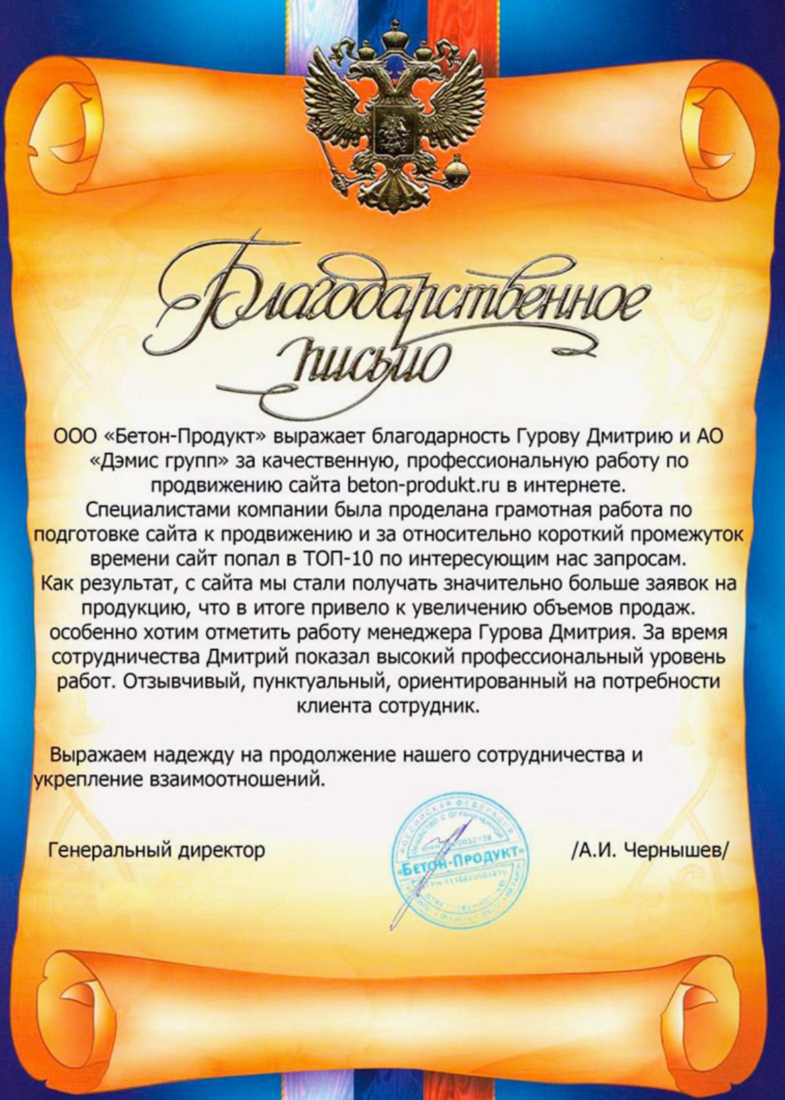 Выражаем свою благодарность коллективу отдела технической поддержки компании Demis Group за добропорядочные партнерские отношения, проявленные во время работы. За время нашего сотрудничества был полностью изменен дизайн сайта – это позволило значительно улучшить его восприятие. Все задачи по технической поддержке сайта deegl.ru были выполнены качественно и своевременно.
