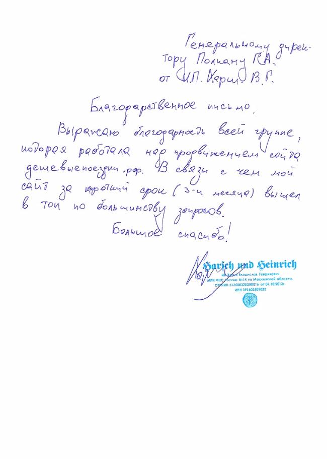 Выражаю благодарность всей группе, которая работала над продвижением сайта дешевыепоездки.рф. В связи с чем мой сайт за короткий срок (3-и месяца) вышел в ТОП по большинству запросов.