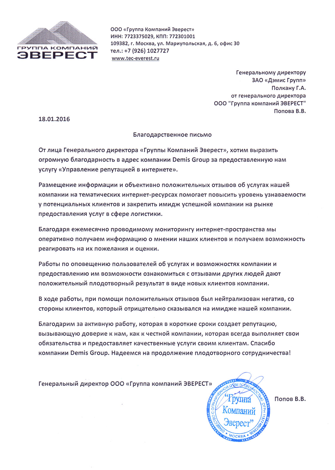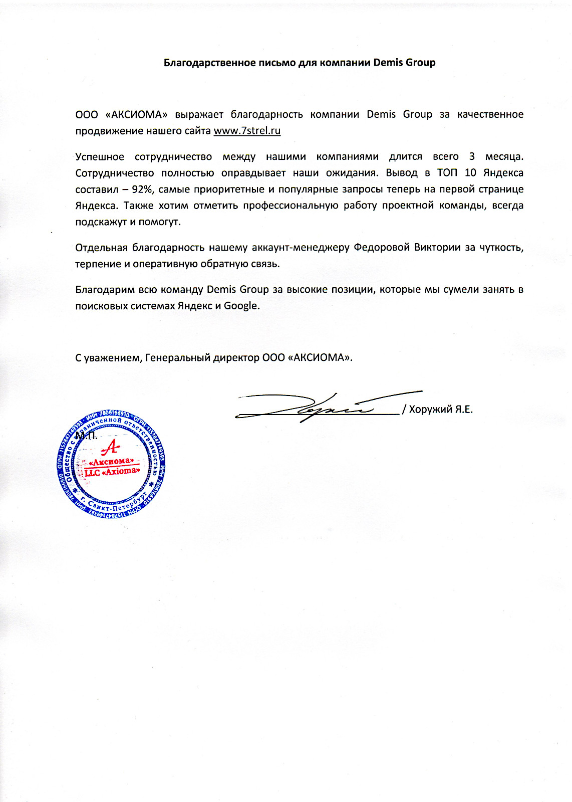 Мы заключили договор на оказание услуги продвижения сайта detstvosnami.ru всего 9 месяцев назад, однако даже за такой маленький промежуток времени, специалисты Demis Group смогли вывести наш сайт в ТОП поисковых систем по части продвигаемых запросов. Такой результат подтвердил то, что мы сделали верный выбор, обратившись в эту SEO-компанию.
