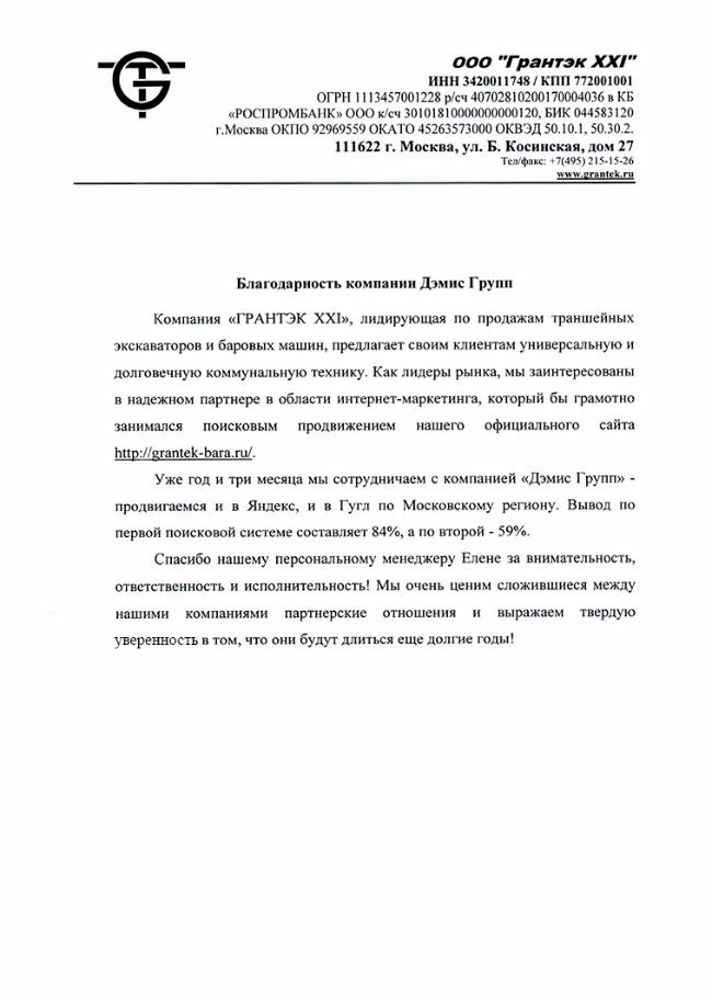 Как лидеры рынка, мы заинтересованы в надежном партнере в области интернет-маркетинга, который бы грамотно занимался поисковым продвижением нашего официального сайта http://grantek-bara.ru.