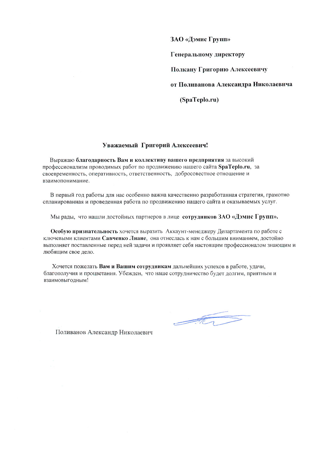 Выражаем признательность за контентное развитие нашего сайта. Тексты, которые были созданы специалистами Demis Group, полностью соответствуют нашим высоким требованиям. Грамотный подход к делу дает видимый результат работ.