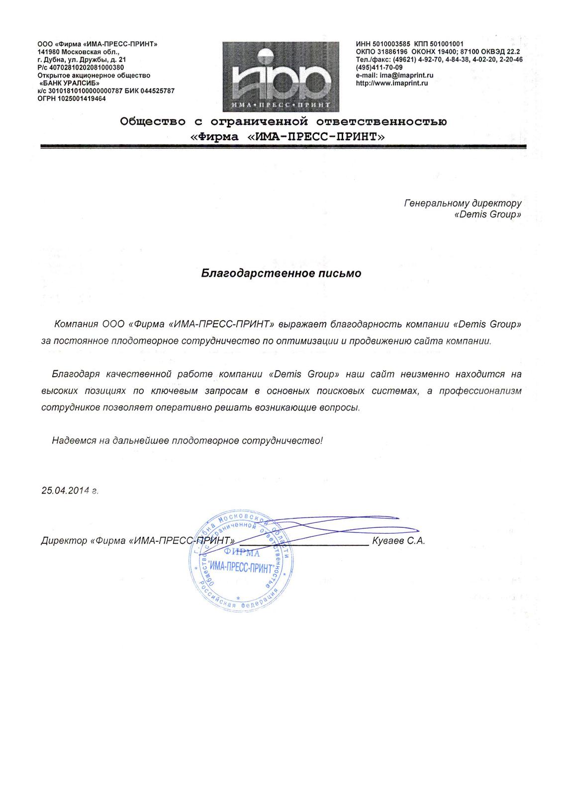 Компания ООО «ИМА-ПРЕСС-ПРИНТ» выражает благодарность компании «Demis Group» за постоянное плодотворное сотрудничество по оптимизации и продвижению сайта компании.