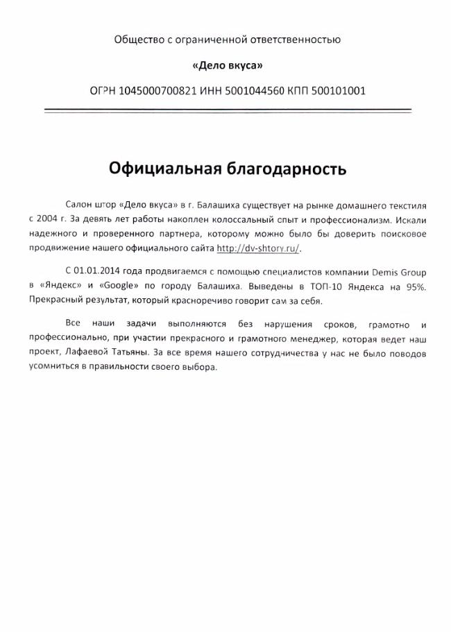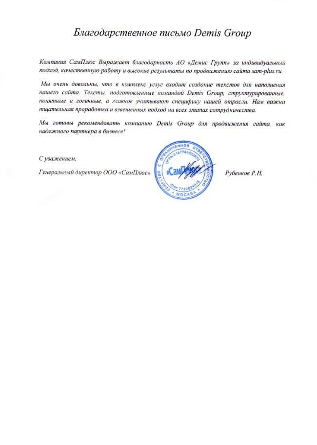 Благодаря качественной работе компании «Demis Group» наш сайт неизменно находится на высоких позициях по ключевым запросам в основных поисковых системах, а профессионализм сотрудников позволяет оперативно решать возникающие вопросы.