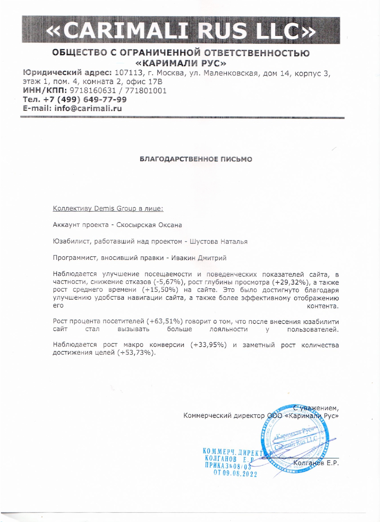 Несмотря на то, что мы только начали сотрудничать в области поискового продвижения (SEO), хотим выразить благодарность за такой мощный старт в работе. Мы были приятно удивлены тем, как специалисты Demis Group быстро приступили к оптимизации нашего сайта www.irkberega.com.