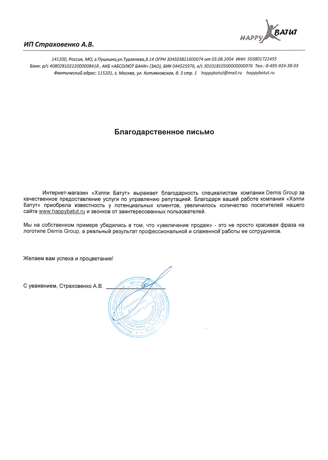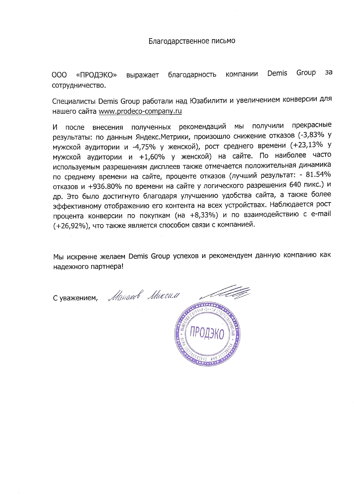 Сотрудничество с ЗАО «Дэмис Групп» позволило вывести нашу деятельность на новый уровень! Силами технической поддержки были обновлены и переработаны разделы сайта, изменен его дизайн на более привлекательный и соответствующий тематике предоставляемых нами услуг. Спасибо за Вашу работу!