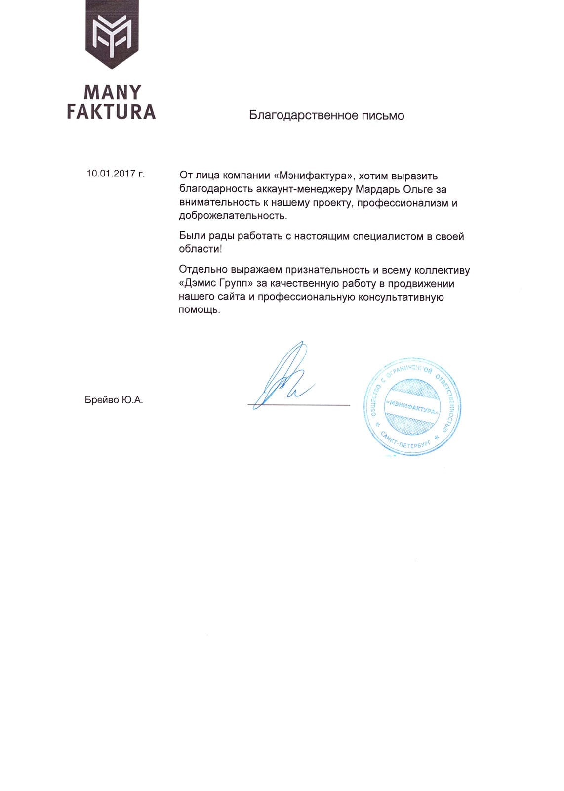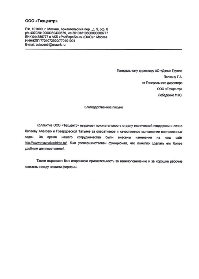 За время нашего сотрудничества были внесены изменения на наш сайт www.maznakashirke.ru, был усовершенствован функционал, что помогло сделать его более удобным для посетителей. Также выражаем Вам искреннюю признательность за взаимопонимание и за хорошие рабочие контакты между нашими фирмами.