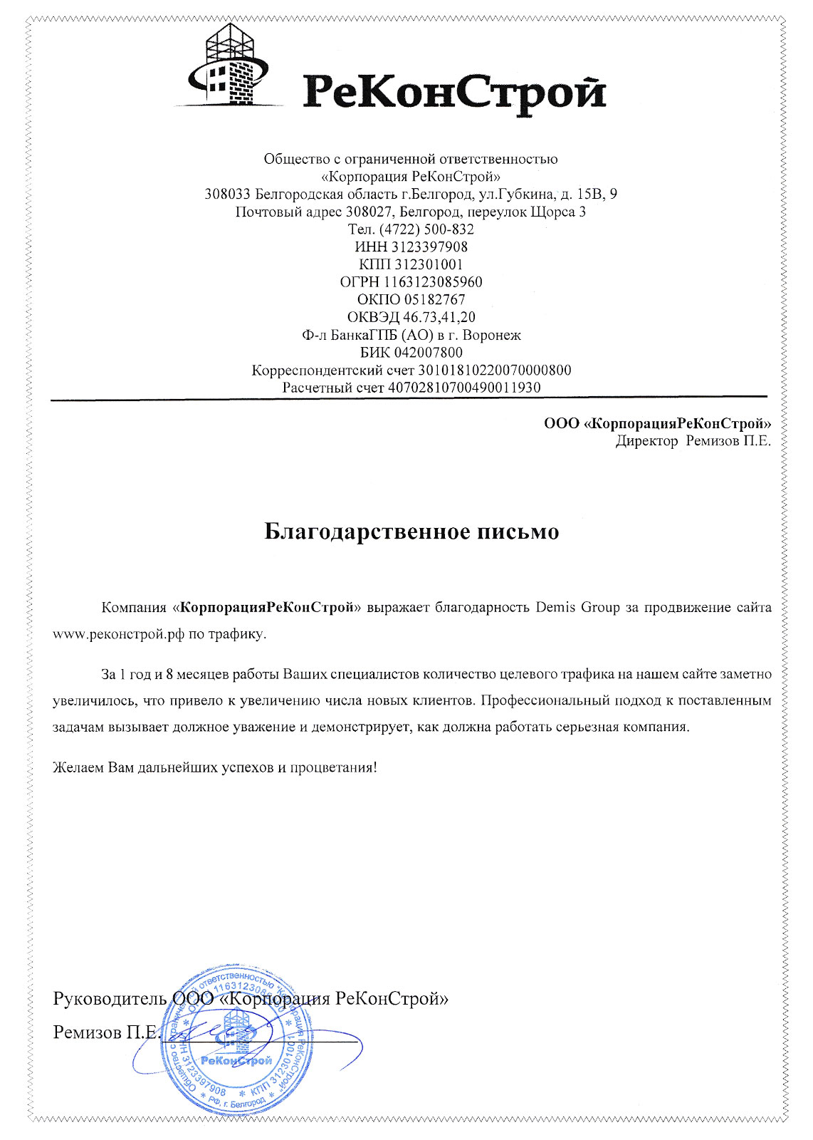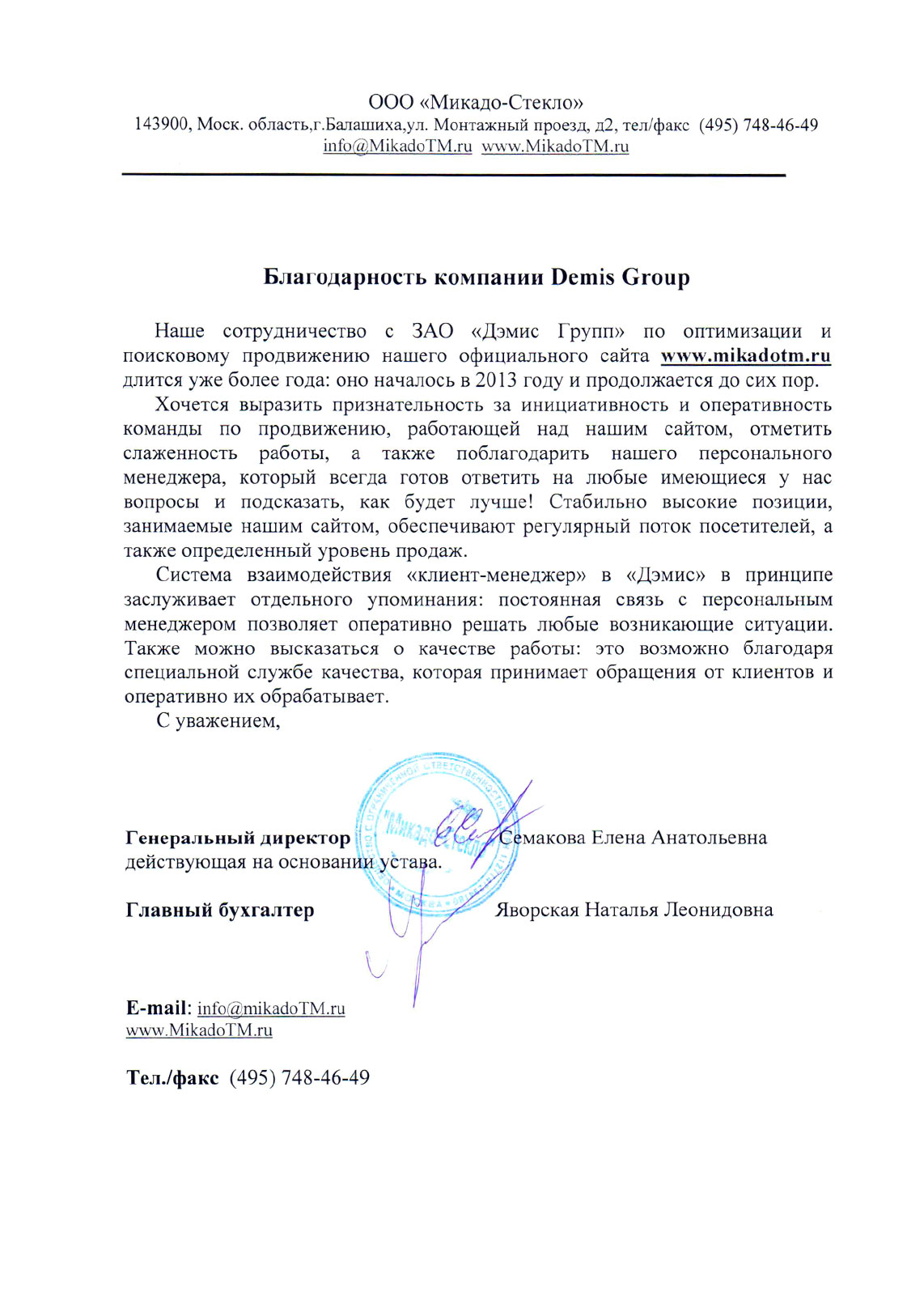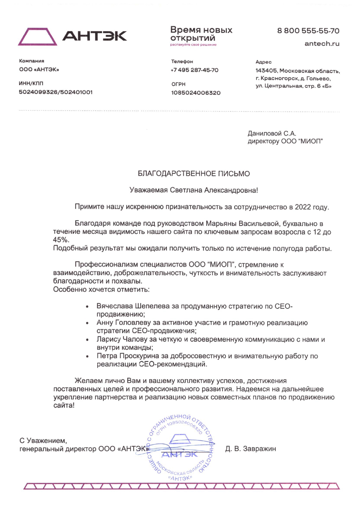 Хочется выразить признательность за инициативность и оперативность команды по продвижению, работающей над нашим сайтом, отметить слаженность работы, а также поблагодарить нашего персонального менеджера, который всегда готов ответить на любые имеющиеся у нас вопросы и подсказать, как будет лучше! Стабильно занимаемые нашим сайтом высокие позиции обеспечивают регулярный поток посетителей, а также определенный уровень продаж.
