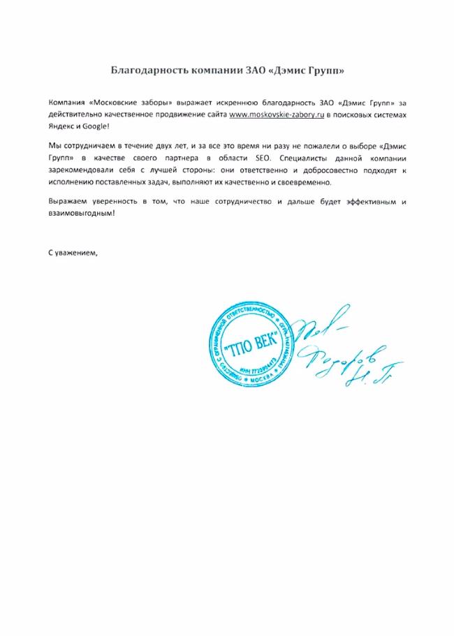 Компания «Московские заборы» выражает искреннюю благодарность ЗАО «Дэмис Групп» за действительно качественное продвижение сайта www.moskovskie-zabory.ru в поисковых системах Яндекс и Google!