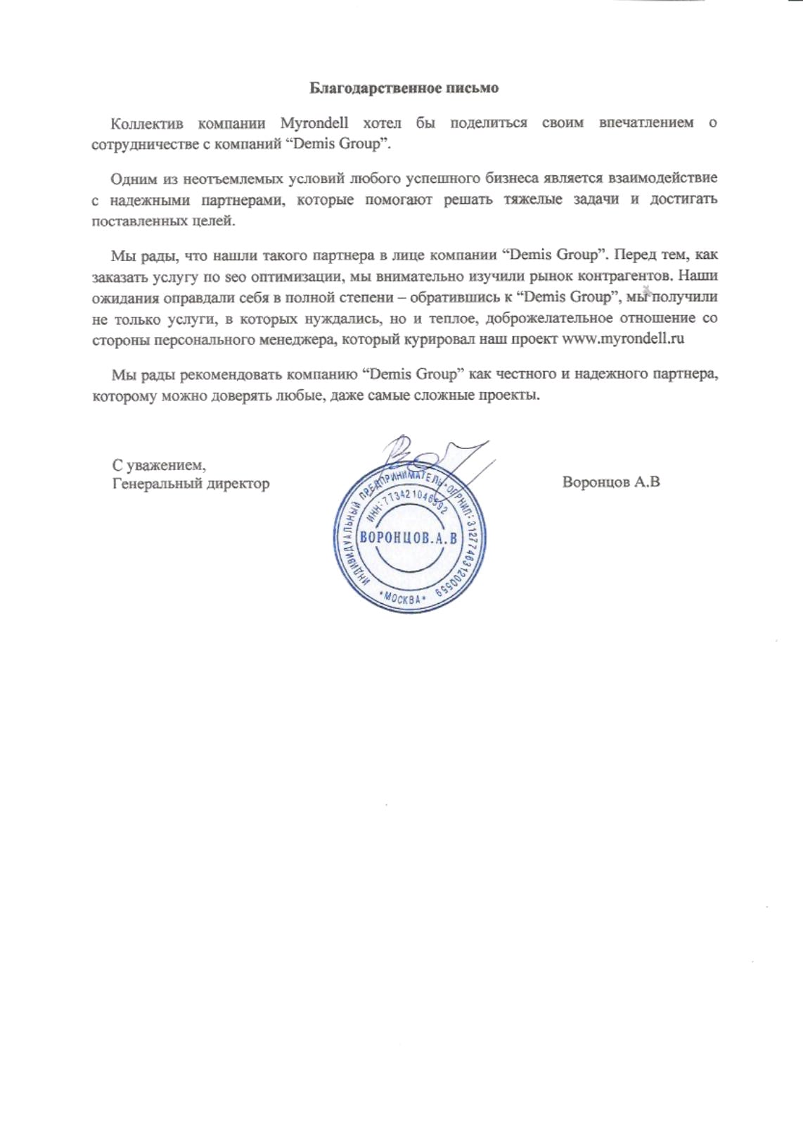Мы рады, что нашли такого партнера в лице компании Demis Group. перед тем, как заказать услугу по SEO-оптимизации, мы внимательно изучили рынок контрагентов. наши ожидания оправдали себя в полной степени — обратившись к Demis Group, мы получили не только услуги, в которых нуждались, но и теплое, доброжелательное отношение со стороны персонального менеджера, который курировал наш проект www.myrondell.ru.