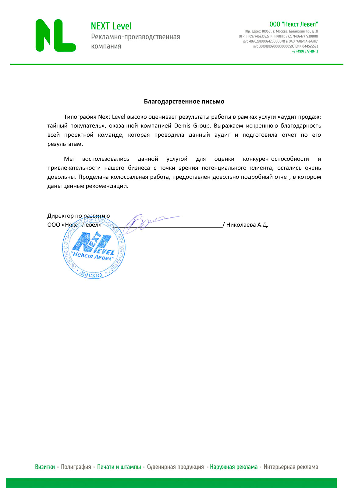 Типография Next Level высоко оценивает результаты работы в рамках услуги «аудит продаж: тайный покупатель», оказанной компанией Demis Group.