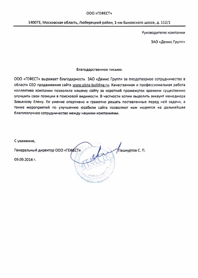 ООО «ГЕФЕСТ» выражает благодарность ЗАО «Дэмис Групп» за плодотворное сотрудничество в области CEO продвижения сайта www.okna-building.ru. Качественная и профессиональная работа коллектива компании позволила нашему сайту за короткий промежуток времени существенно улучшить свои позиции в поисковой видимости.