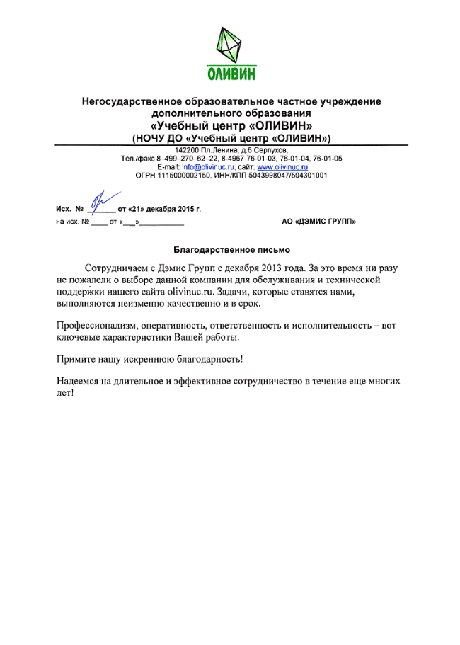 Сотрудничаем с Дэмис Групп с декабря 2013 года. За это время ни разу не пожалели о выборе данной компании для обслуживания и технической поддержки нашего сайта olivinuc.ru. Задачи, которые ставятся нами, выполняются неизменно качественно и в срок.