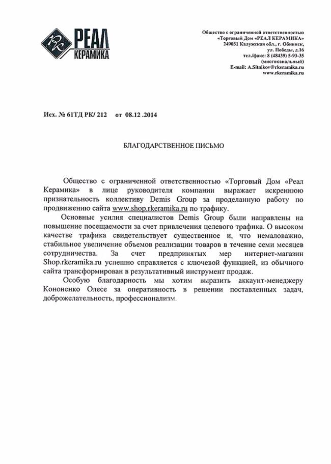 О высоком качестве трафика свидетельствует существенное и, что немаловажно, стабильное увеличение и объемов реализации товаров в течение семи месяцев сотрудничества. За счет предпринятых мер интернет-магазин www.shop.rkeramika.ru успешно справляется с ключевой функцией, из обычного сайт трансформирован в результативный инструмент продаж.