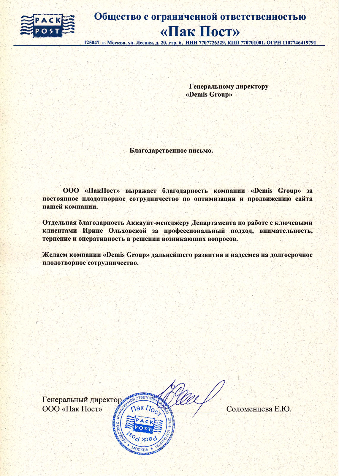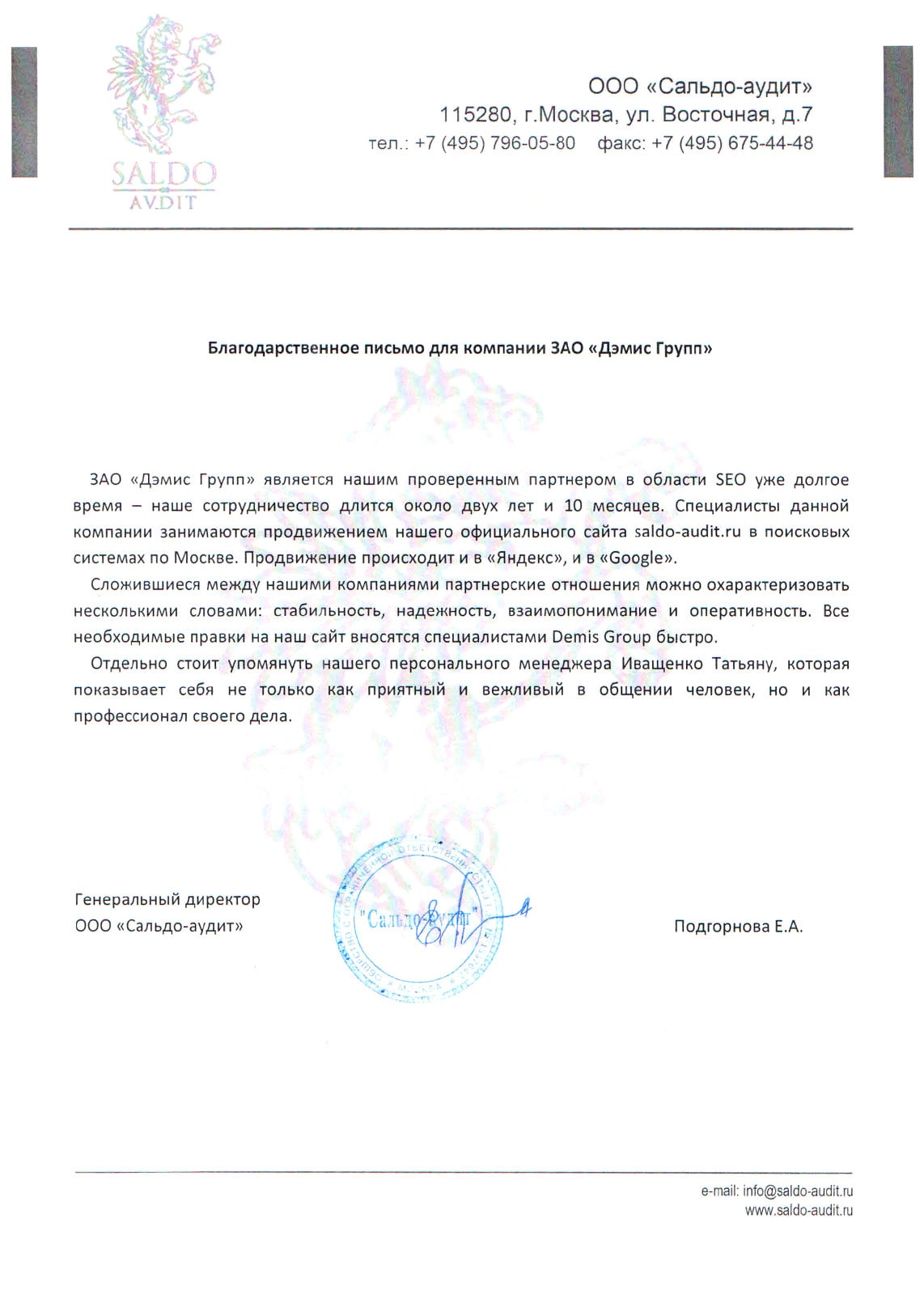 ЗАО «Дэмис Групп» является нашим проверенным партнером в области SEO уже долгое время – наше сотрудничество длится около двух лет и 10 месяцев. Сложившиеся между нашими компаниями партнерские отношения можно охарактеризовать несколькими словами: стабильность, надежность, взаимопонимание и оперативность. Все необходимые правки на наш сайт вносятся специалистами Demis Group быстро.