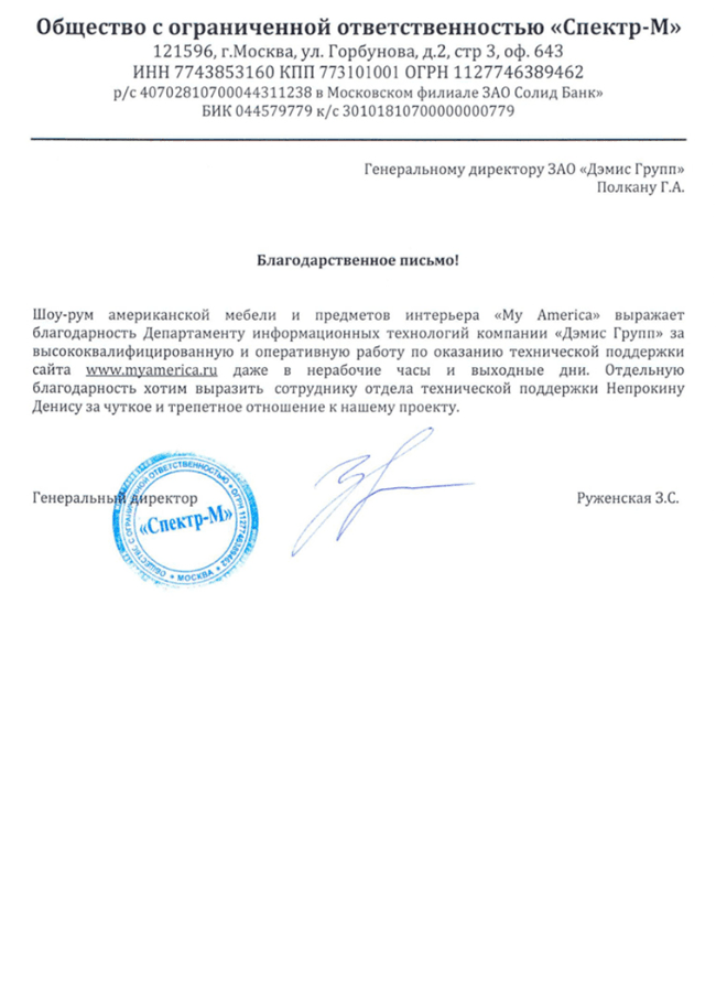 Шоу-рум американской мебели и предметов интерьера «My America» выражает благодарность Департаменту информационных технологий компании «Дэмис Групп» за высококвалифицированную и оперативную работу по оказанию технической поддержки сайта www.myamerica.ru даже в нерабочие дни.