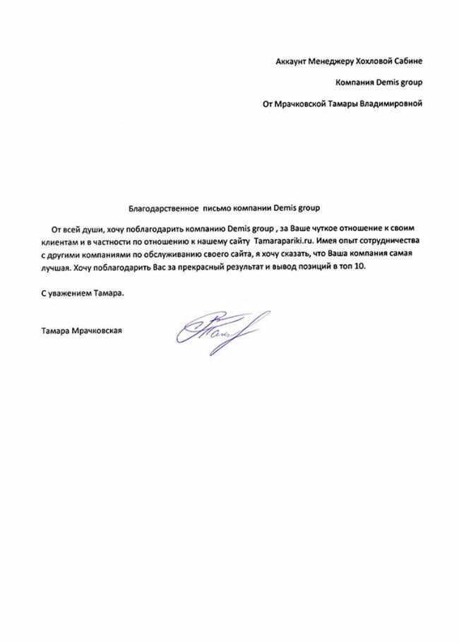 От всей души хочу поблагодарить компанию Demis Group за ваше чуткое отношение к своим клиентам и в частности по отношению к сайту http://tamarapariki.ru/. Имея опыт сотрудничества с другими компаниями по обслуживанию своего сайта, я хочу сказать, что Ваша компания самая лучшая. Хочу поблагодарить Вас за прекрасный результат и вывод позиций в ТОП-10.