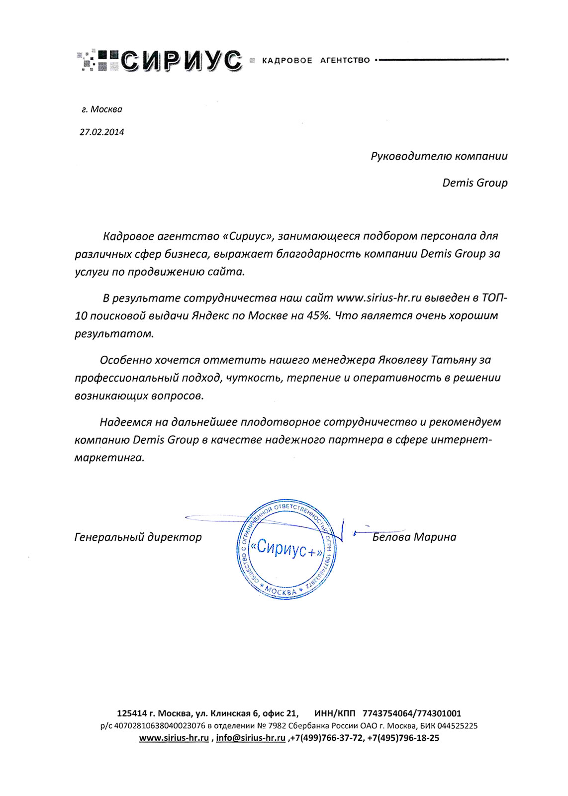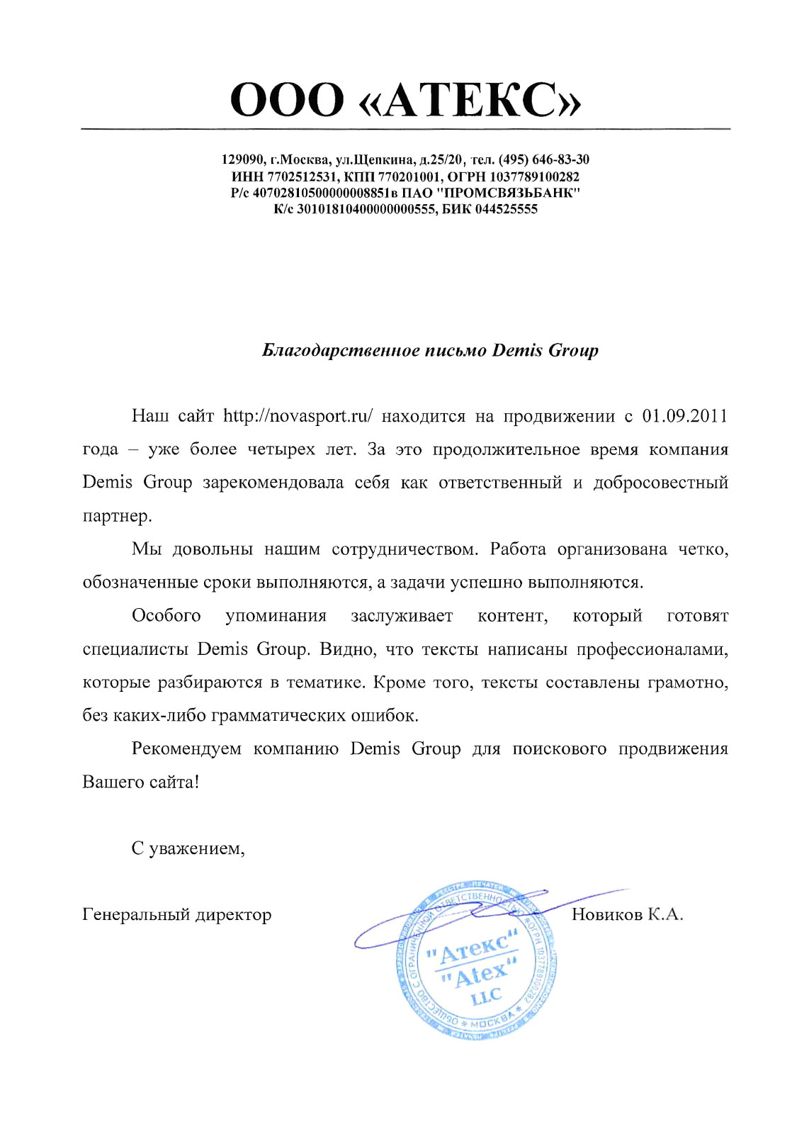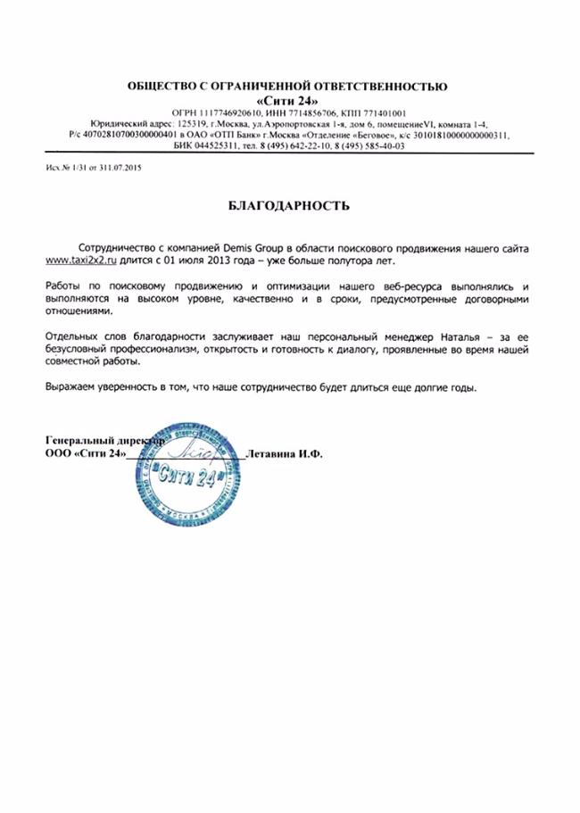 Сотрудничество с компанией Demis Group в области поискового продвижения нашего сайта www.taxi2x2.ru длится с 01 июля 2013 года — уже больше полутора лет. Работы по поисковому продвижению и оптимизации нашего веб-ресурса выполнялись и выполняются на высоком уровне, качественно и в сроки, предусмотренные договорными отношениями.