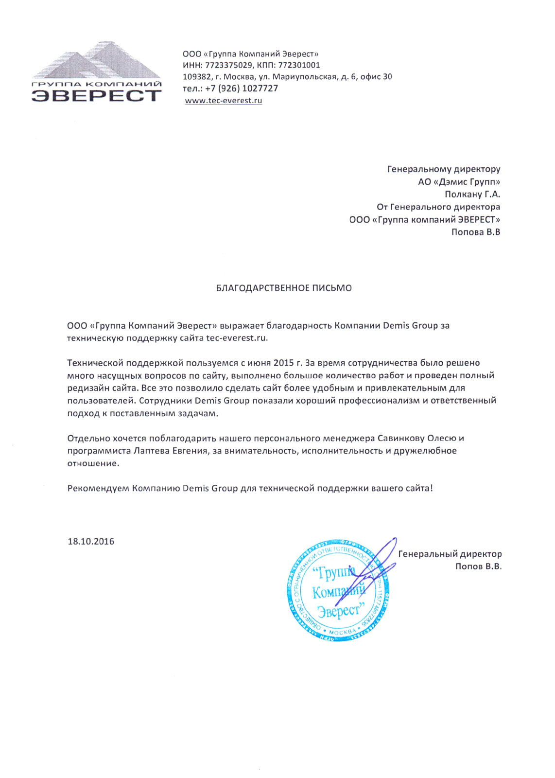 ООО «Группа Компаний Эверест» выражает благодарность Компании «Demis Group» за техническую поддержку сайта tec-everest.ru.