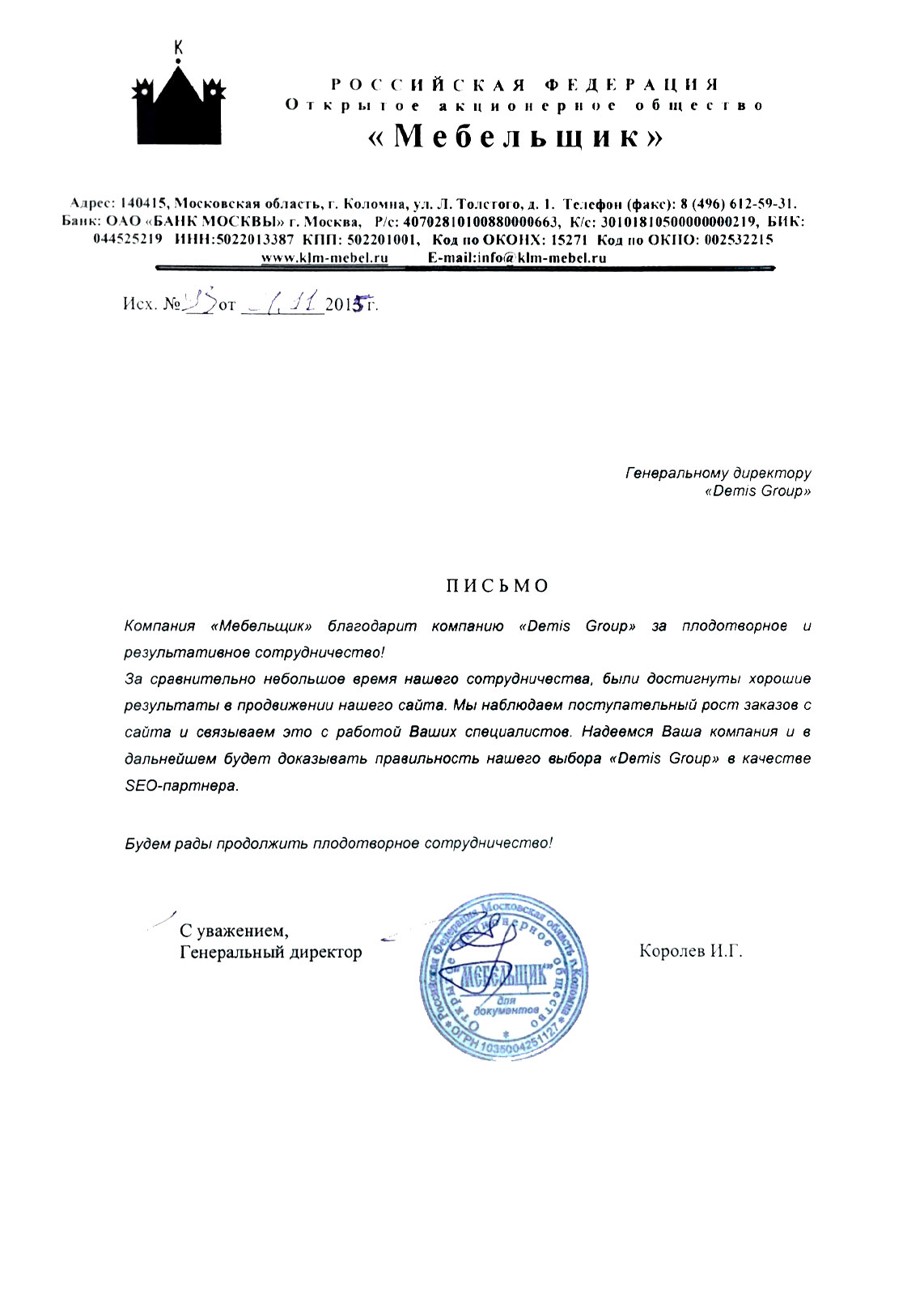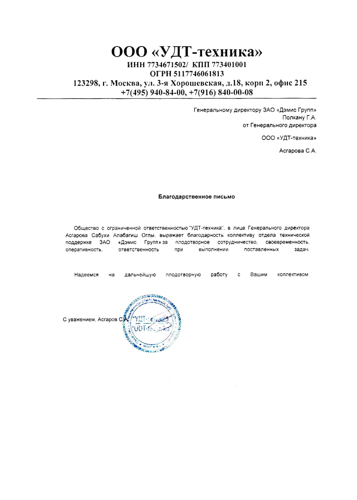 Получено благодарственное письмо от ООО «УДТ-техника»