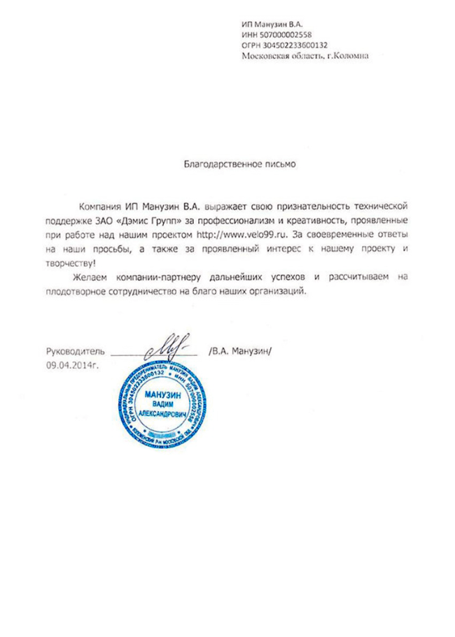 Компания ИП Манузин В.А. выражает свою признательность ЗАО «Дэмис Групп» за профессионализм и креативность, проявленные при работе над нашим проектом www.velo99.ru. За своевременные ответы на наши просьбы, а также за проявленный интерес к нашему проекту и творчеству.