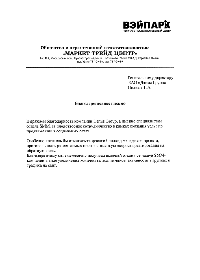 Особенно хотелось бы отметить творческий подход менеджера проекта, оригинальность размещаемых постов и высокую скорость реагирования на обратную связь. Благодаря этому мы ежемесячно получаем высокий отклик от нашей SMM-кампании в виде увеличения количества подписчиков, активности в группах и трафика на сайт.