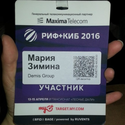 «В прошедшем месяце я вместе с коллегами из Отделов SMM, UX и УА вошла в состав тамбовской делегации Demis Group на масштабной конференции «РИФ+КИБ 2016». Это был достаточно интересный опыт: вместе с Наташей Калинушкиной и Настей Новиковой мы участвовали в мини-квесте, где, как мне кажется, показали себя отличной командой, разгадывали логические задачки, общались с другими посетителями форума и т. п. Но, конечно же, основной задачей было посещение различных секций форума.