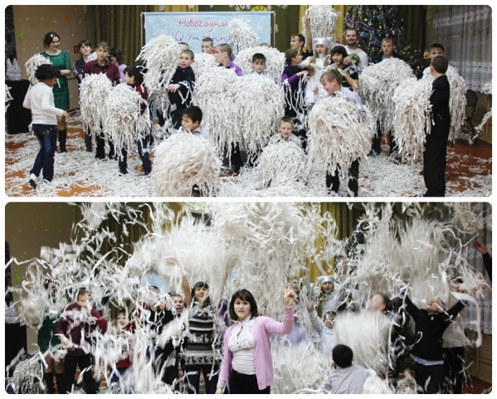 Огромные белоснежные горы бумаги можно было использовать по-разному: перебрасываться как снежками, мастерить наряды и прически разных размеров и форм и, конечно же, просто раскидывать её везде.