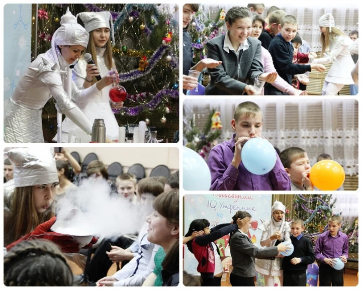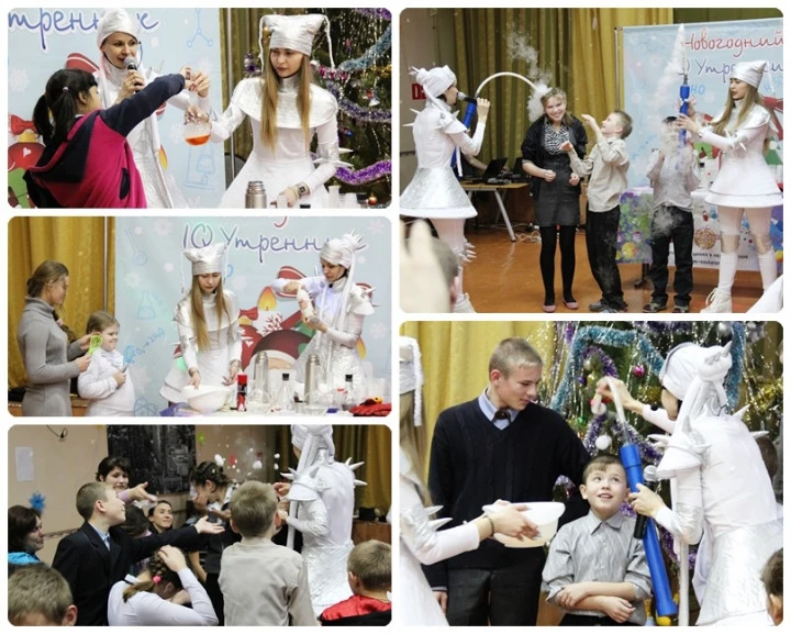 Как только Дедушка Мороз со Снегурочкой раздали всем по сладкому петушку на палочке, выслушали все стихотворения и поиграли во всевозможные игры, они передали слово своим верным друзьям Морозилкиной и Снежинкиной, которые приготовили для ребят удивительное погружение в сумасшедшую науку.