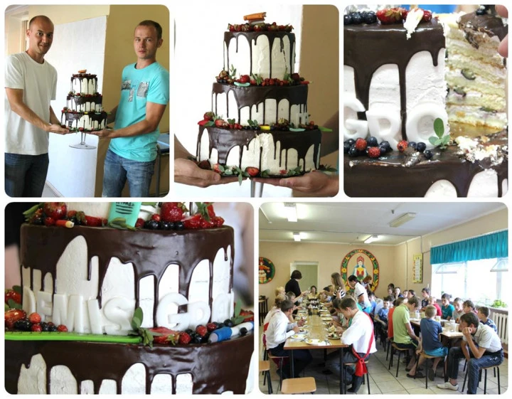 Конечно, мы подготовили для ребят и большой праздничный торт. Он, и правда, был не только очень красивым, но и безумно вкусным. Хватило ровно 15 минут, чтобы опустошить тарелки, выпить чая и всем дружно выйти на улицу!